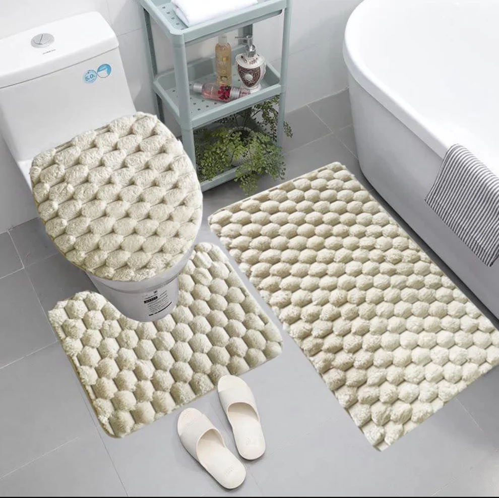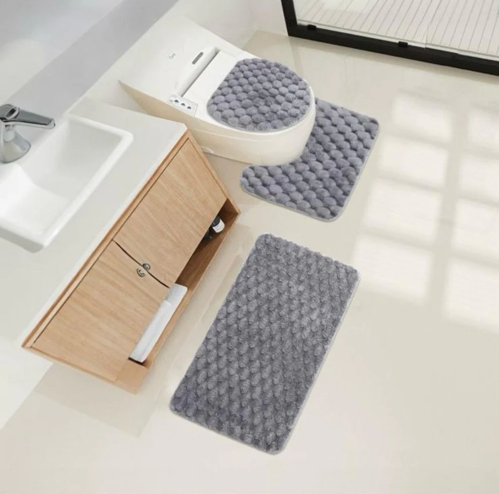🏠 COMPLETE 3-PIECE SET: Includes floor mat, bathroom mat, and toilet lid cover for full coverage