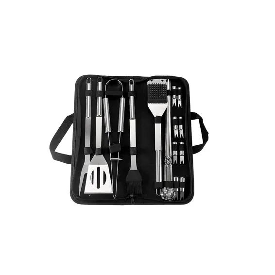 The most complete grilling kit for masters and beginners alike. Includes 18 pieces for cooking, serving, and cleaning.