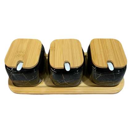 Black Marble Set of 3 Canisters with Bamboo Lid and Base