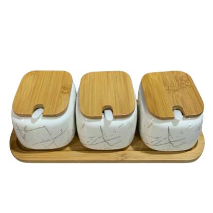 White Marble Set of 3 Canisters with Bamboo Lid and Base