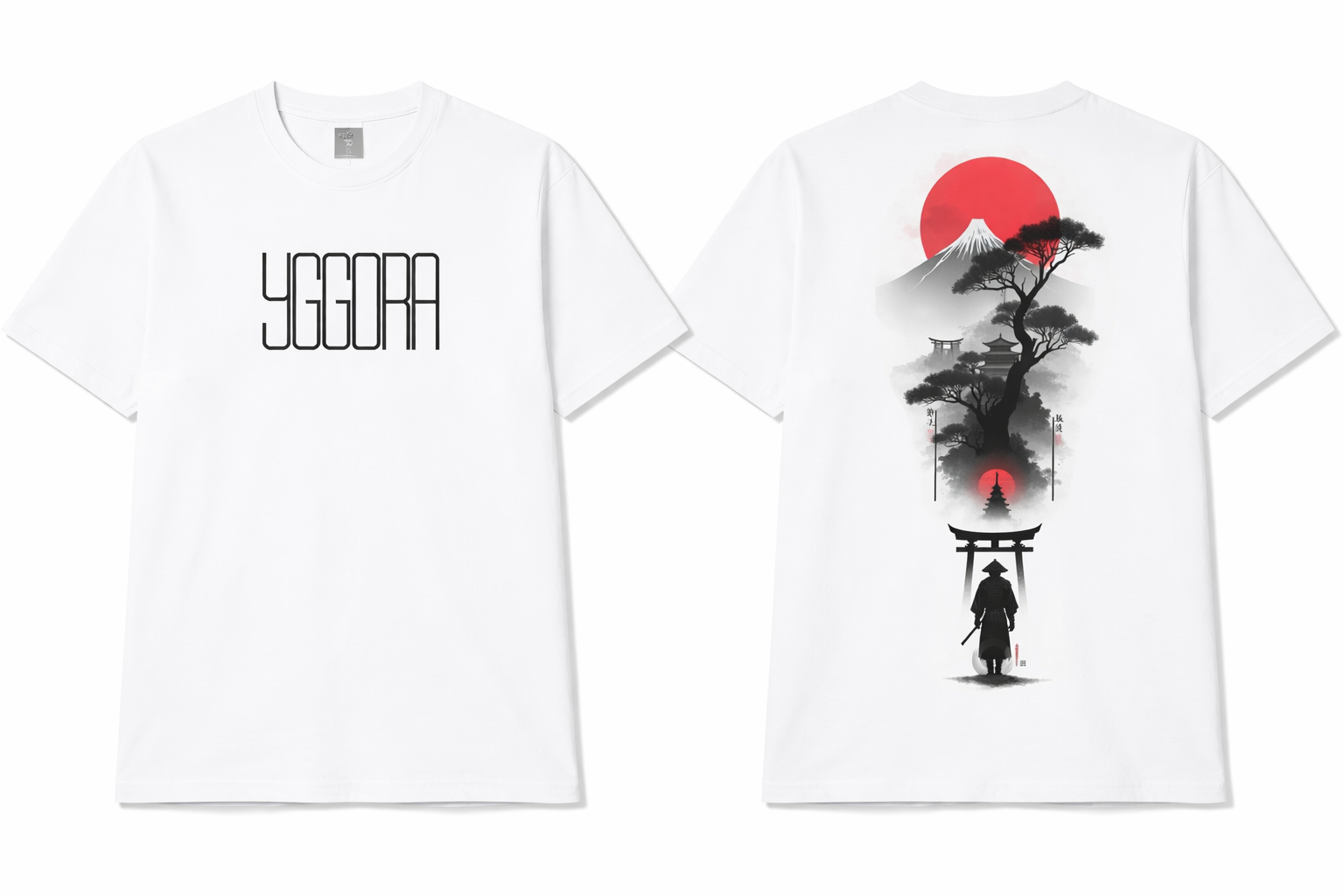 A minimalist yet striking t-shirt design that blends modern typography with traditional Japanese-inspired art. The front features the bold “YGGDRA” logo centered for a sleek, contemporary look. On the back, an intricate vertical illustration captures a serene landscape with a rising red sun, a majestic mountain, and silhouetted trees, leading down to a lone samurai standing beneath a torii gate. The contrast of soft grayscale tones with vivid red accents creates a calm but powerful aesthetic, symbolizing balance, strength, and journey. Perfect for those who appreciate culture-inspired streetwear with a refined edge.